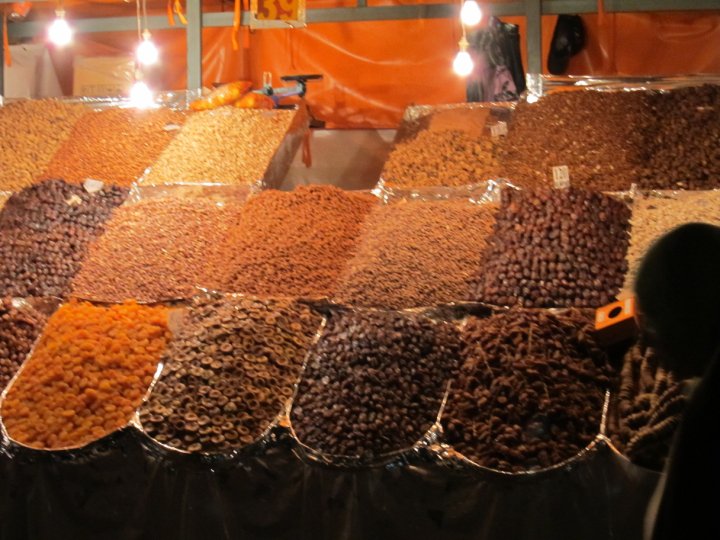 datesEven better, in the evening the Djemaa el Fna transforms to a food wonderland, with the smaller wheeled carts moving to the edges to make way for a couple of hundred tented stalls, many with water and electrical hookups, all with seating, cooking some of the most delicious food we’ve ever had. It’s easy to tell the tourist traps from the good food: the red-and-white check plastic tablecloths and hawkers cries of “Shish kebab, very good, here!”, not to mention the groups of fanny-packed, white sneakered folks, told us to keep walking.