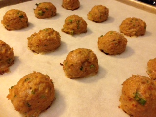 Add all of the above ingredients to a large bowl, waiting until you have added everything before you start mixing, very gently, with clean hands. Mix just enough until you no longer see streaks of the yogurt or harissa. Form mixture into ping-pong-ball-size meatballs (I use a spring-release tablespoon scoop, which makes life really easy) and place onto a parchment-lined half sheet pan. You should get about 36-40 meatballs.