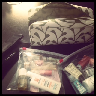 Here’s our actual toiletry kit for our upcoming visit to New Orleans – four nights, five days. The black makeup bag will fit inside the green and white bag, which contains our deodorant, a hairbrush, prescriptions, q-tips, bandaids. The two zip-top bags have all our liquids, which have to be pulled out separately for security so they’ll go in an outside pocket of one of our two carry-ons (we take one duffel-type bag, and one small wheelie).