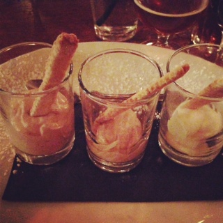 The final, dessert course was a trio of chocolate mousse: white, milk, and dark. Being a dark chocolate fan, I went right for that one, and noticed it didn’t seem as dark as Rob’s. It was good, but a taste comparison with his made me suspect they mixed milk & dark together (accidentally? or perhaps they were running low) on my plate. Each small glass of mousse had a sweet cookie stick. The beer pairing was quite interesting – a bourbon barrel aged imperial stout, that was strong, uncarbonated, and very much like a port.
