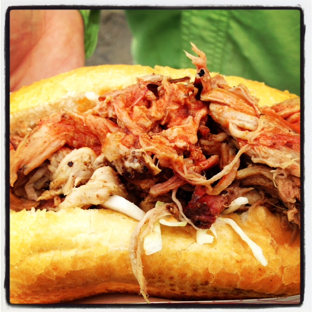 The other must-eat item on our list was a Cochon de Lait po-boy ($6). A mound of pulled pork on top of creamy, mustardy cole slaw, hot sauce optional but highly recommended. This sandwich is so large we always split it: