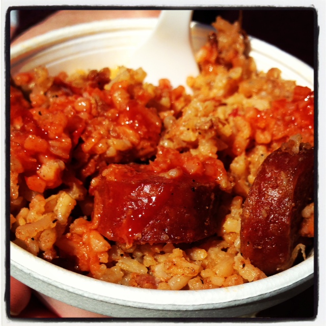 Finally, we also tried some Jambalaya. Two different vendors have it there (unusual for the Fest, where there is typically only one vendor for each item, providing the greatest variety). Rob cooks a fantastic Jambalaya at home, so it’s always interesting to try other versions. This was very good, made traditionally with Andouille, and a good sized bowl was $6: