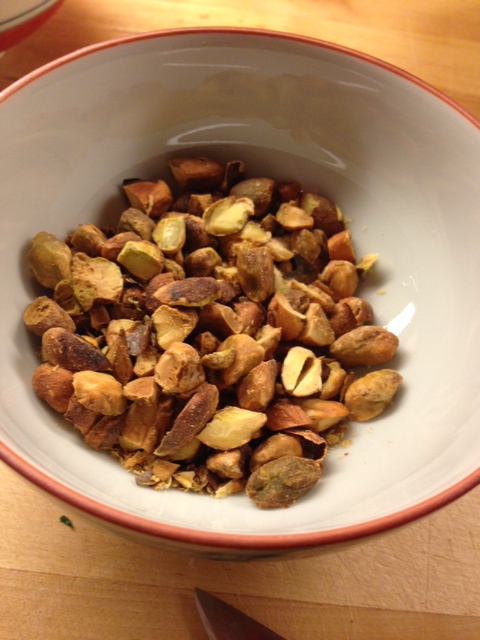 Tip: My package of pistachios, though already roasted, had lost a bit of their “crunch”; I put them on a sheet pan in a 400° oven for about 7 minutes, and that brought their nutty crunch back nicely.