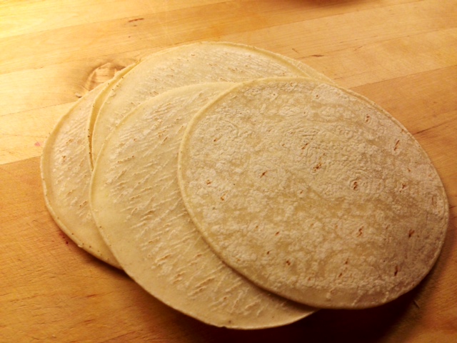 In a large saute pan, heat a couple of tablespoons of olive oil until very hot. Add the onion, garlic and crushed red pepper, and cook, stirring frequently until the onions are softened but still a little firm, about 3 minutes. Add the chard, salt & pepper, as well as about a 1/2 cup water. Cover the pan, turn down the heat to low and let cook for about 5 minutes, until the chard is tender. If it gets too dry at any point while cooking, add a little more water. Once the chard is tender, add in the steak, and mix everything together thoroughly. Let cook over low heat, uncovered, to warm the steak through and let most of the liquid evaporate. While this is finishing, warm your tortillas, ideally by toasting lightly over a gas flame, or if you prefer, wrapping in damp paper towels and heating in the microwave for about 45 seconds.