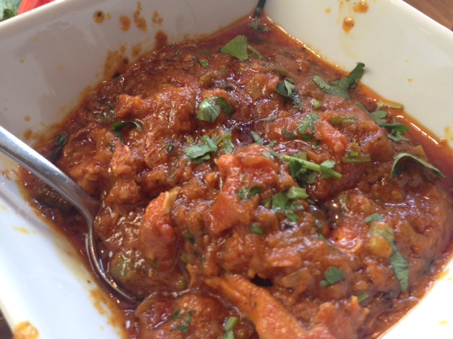 We decided to order primarily from the Nepali section of the menu. The only Nepali food we’d had before were momos, small dumplings filled with meat or vegetables. At the Nepali festival in our neighborhood last year, they were covered in a savory gravy, and then a hot sauce. Yak & Yeti served them more formally, “nude” on a platter with a hot chutney for dipping. We opted for the vegetable momos, which were very good, and the dough was thinner (and therefore lighter) than we had before. A second appetizer, Bhedako Sekuwa, small lamb pieces marinated in spices and then grilled, was very flavorful but a little tough (it’s the only dish we likely would not order again).