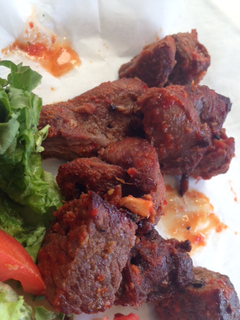 From outside, the restaurant has an unassuming storefront, but inside two small rooms are delightfully decorated, with a Himalayan mural in one room, and whimsical string art covering the wall of the other. We were greeted immediately and offered our choice of tables. Service was pleasant, and prompt, and a small plate of complimentary pakoras were brought to the table. We had a restaurant.com gift certificate that required us to spend a certain amount, so we ordered a bit more than we would have normally.Bhedako Sekuwa