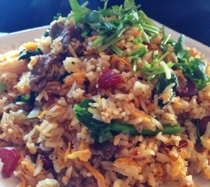 We ordered the three dishes that had been featured on the show: Spicy Garlic Wings, House Special Fried Rice, and the dish that most people seem to come here for, Pho. We were definitely not disappointed. The wings were crispy on the outside, tremendously juicy inside, and very flavorful. Not at all as spicy as we expected, given that the marinade they made included several types of hot peppers. The scallions and cilantro are a nice touch, and the ranch dipping sauce is good, though I didn’t really need it.