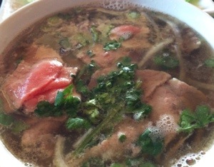Finally, the pho: it was our first time having it, believe it or not, and from what we’ve heard it’s all about the broth. This was fantastic, a perfectly clear, incredibly savory and spicy (not hot spicy) broth, full of star anise and clove, as well a deep rich flavor from all the meat and bones cooked in it for several hours. At OB you can order pho with any combination of meats: brisket, cooked flank steak, raw flank steak, tripe, tendons, even chicken. We decided on the brisket & raw flank combo (the #9).