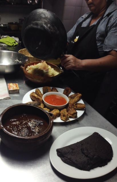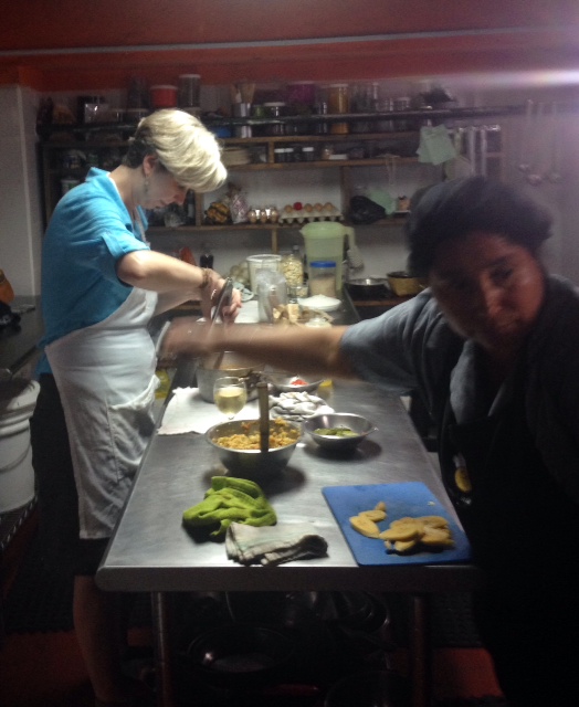 Learning how to make chile rellenos con salsa, mole platanos, and frijoles volteados under Señora Felicia’s watchful eye.