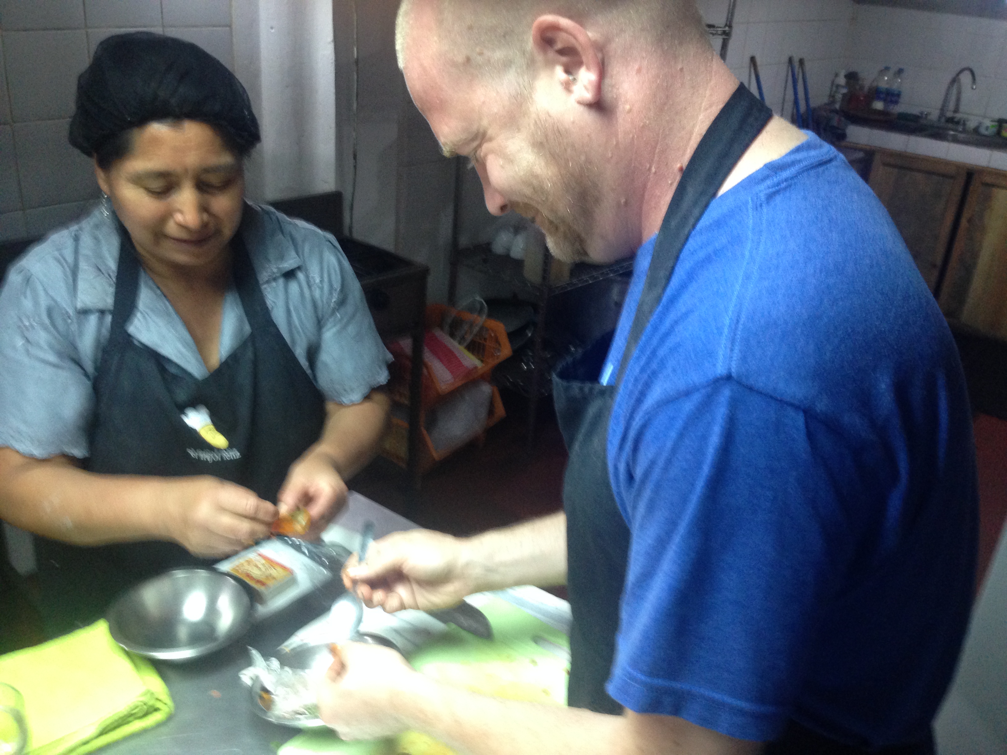 Lessons were held in the back kitchen of a restaurant, and although the owner spoke excellent English (he was from Spain originally, I believe), the woman teaching us was Guatemalan and did not speak English. We had no trouble understanding her instructions with our collective limited Spanish, however.