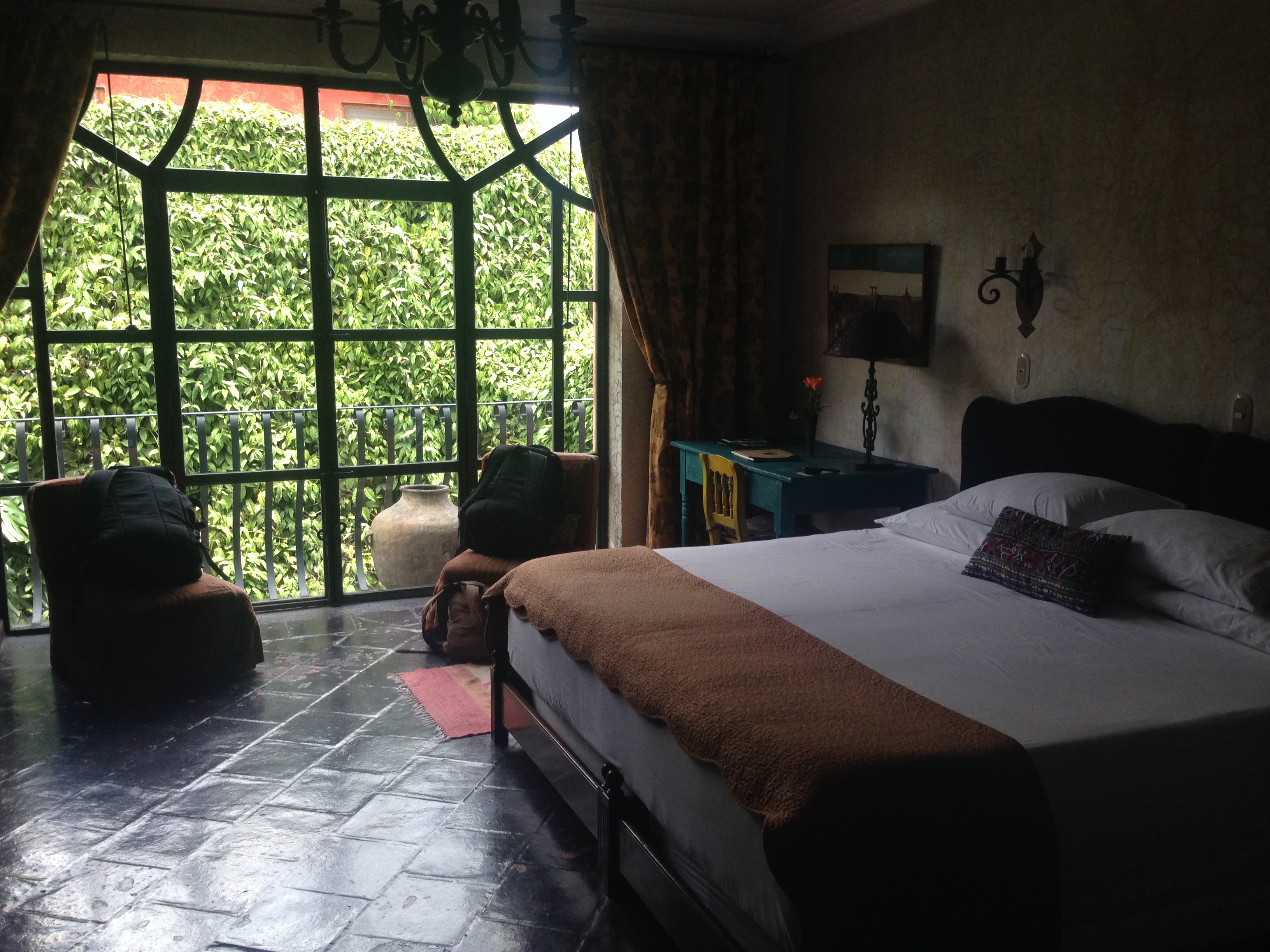 The drive from Lake Atitlan took about two and a half hours, and was a pleasant journey with much to look at on the way. We got to our hotel, the Meson Panza Verde, a little after noon and checked in to find we had been upgraded to a larger room — apparently their standard practice when there are better rooms available. After admiring our delightful accommodations, we freshened up and set out find some lunch.