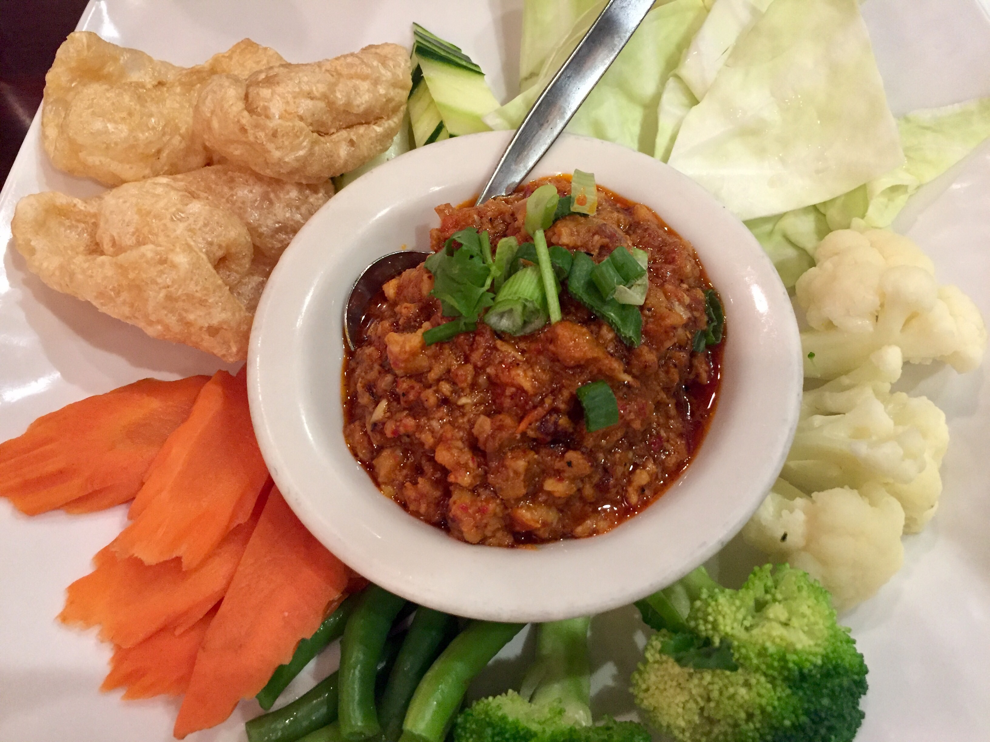 We started with Nam Prik Noom, a very spicy chili dip served with crisp vegetables. Absolutely addictive.