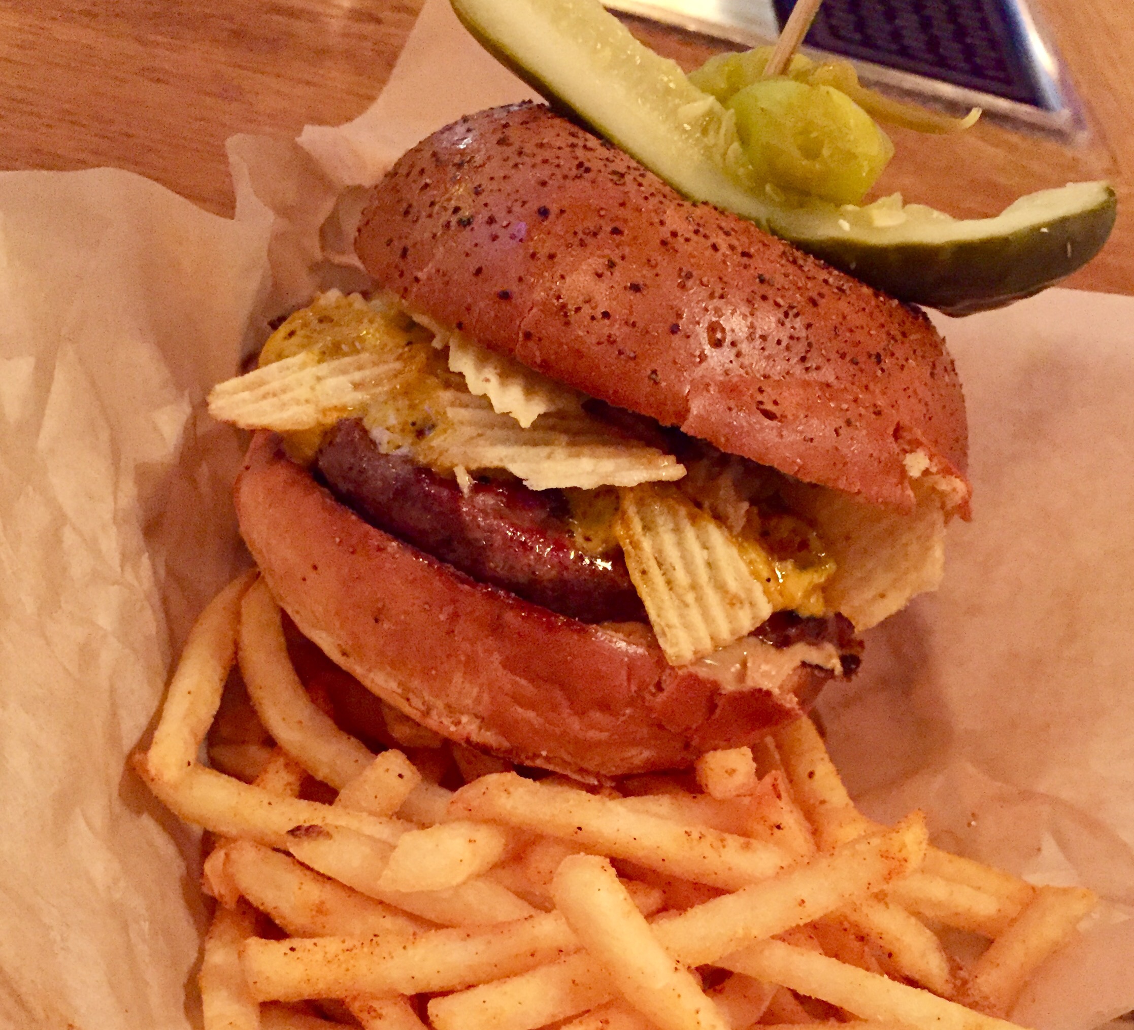 Bacon jam, pimento cheese, peanut butter. Sounds so weird yet they combined into the most delicious topping for a burger I’ve had in a very long time. And the chips added just the crunch you needed with all of the other smooth toppings.