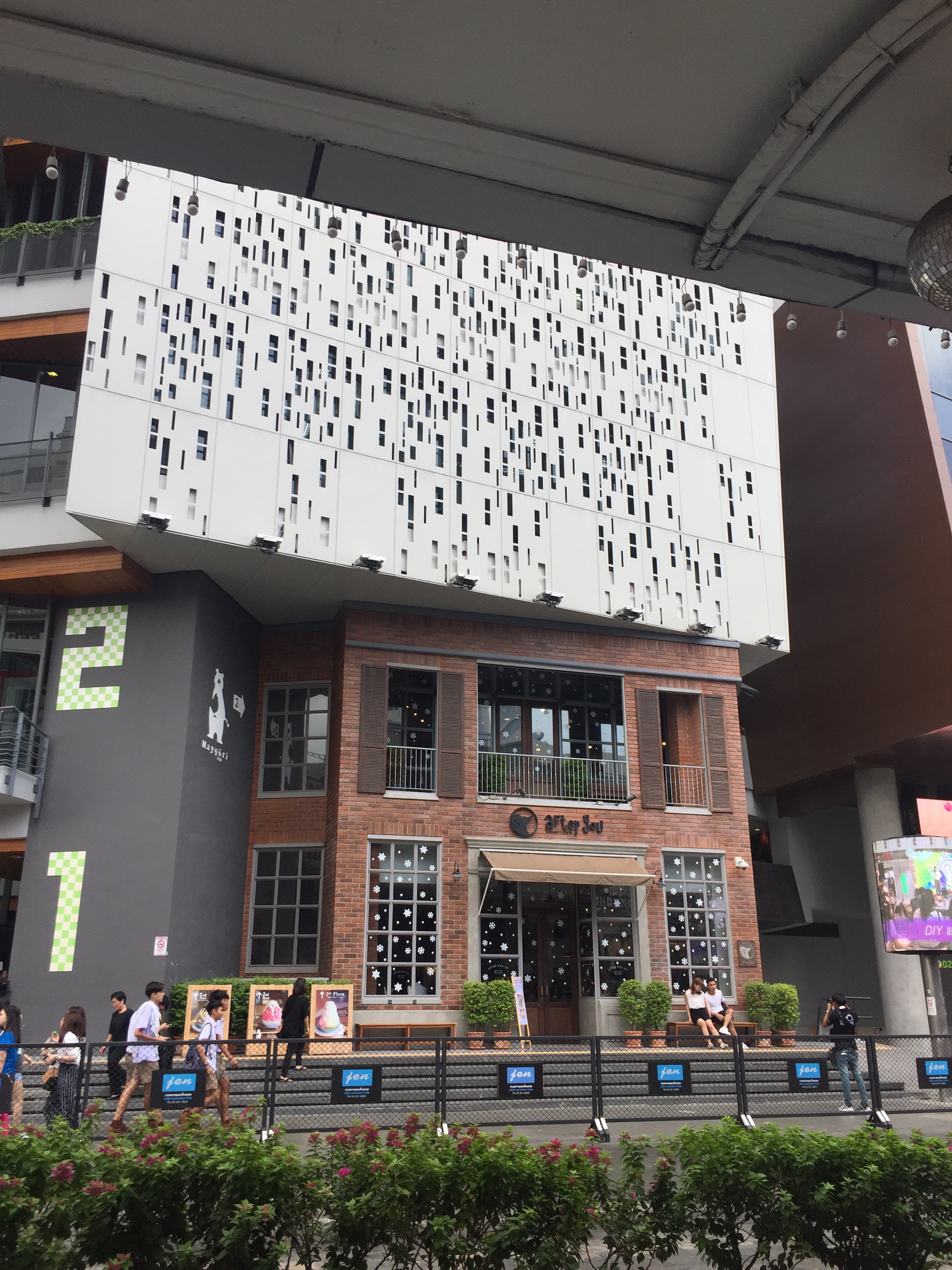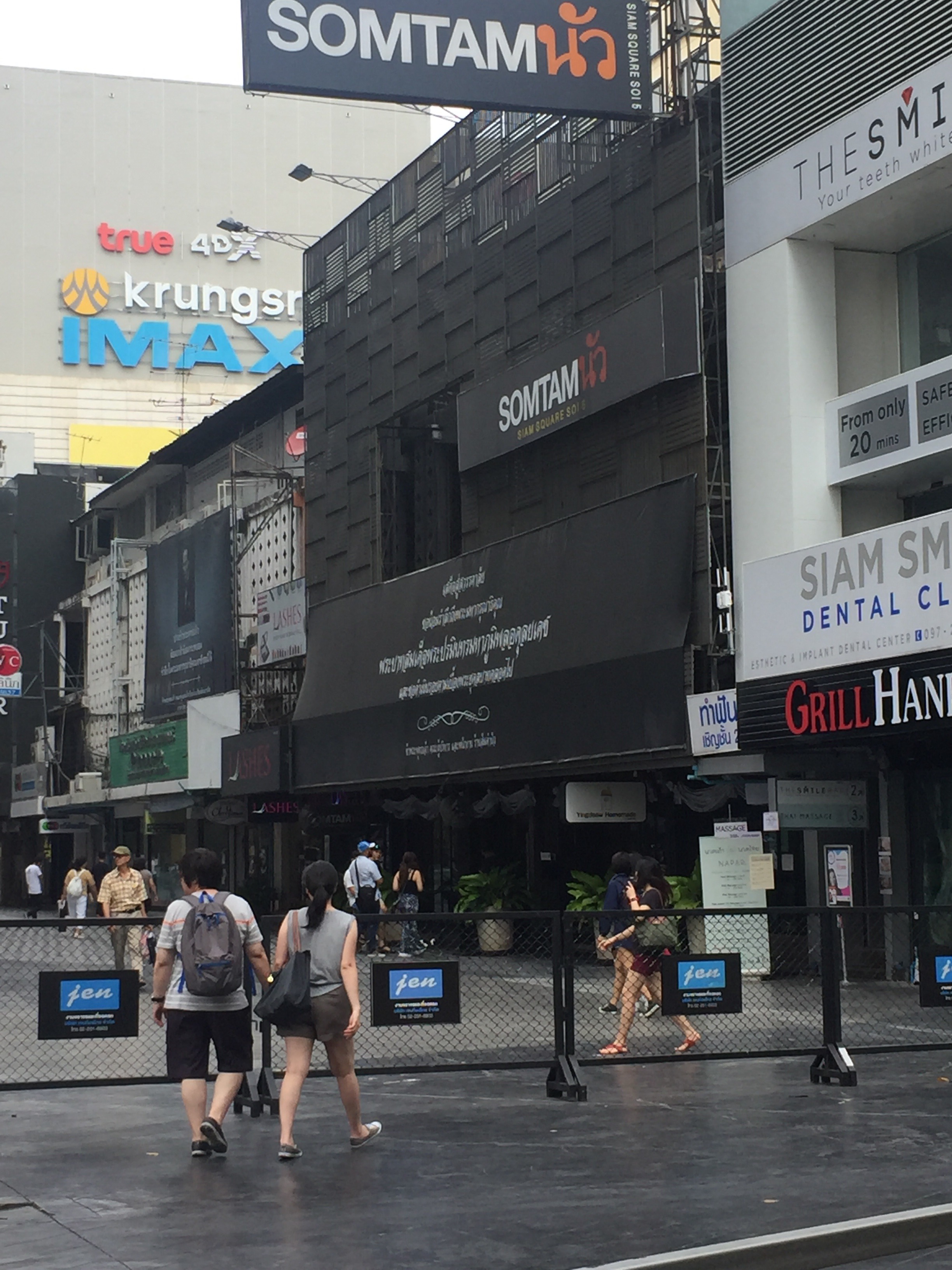 But we did want to check out a bit more of this neighborhood, and found a chic-looking side street with cafes, shops, businesspeople, students in school uniforms, friends out for a late lunch, all quite a modern city scene. We did a quick check on our google map and found a place nearby that we had marked down as supposedly having one of the best somtam salads in Bangkok.