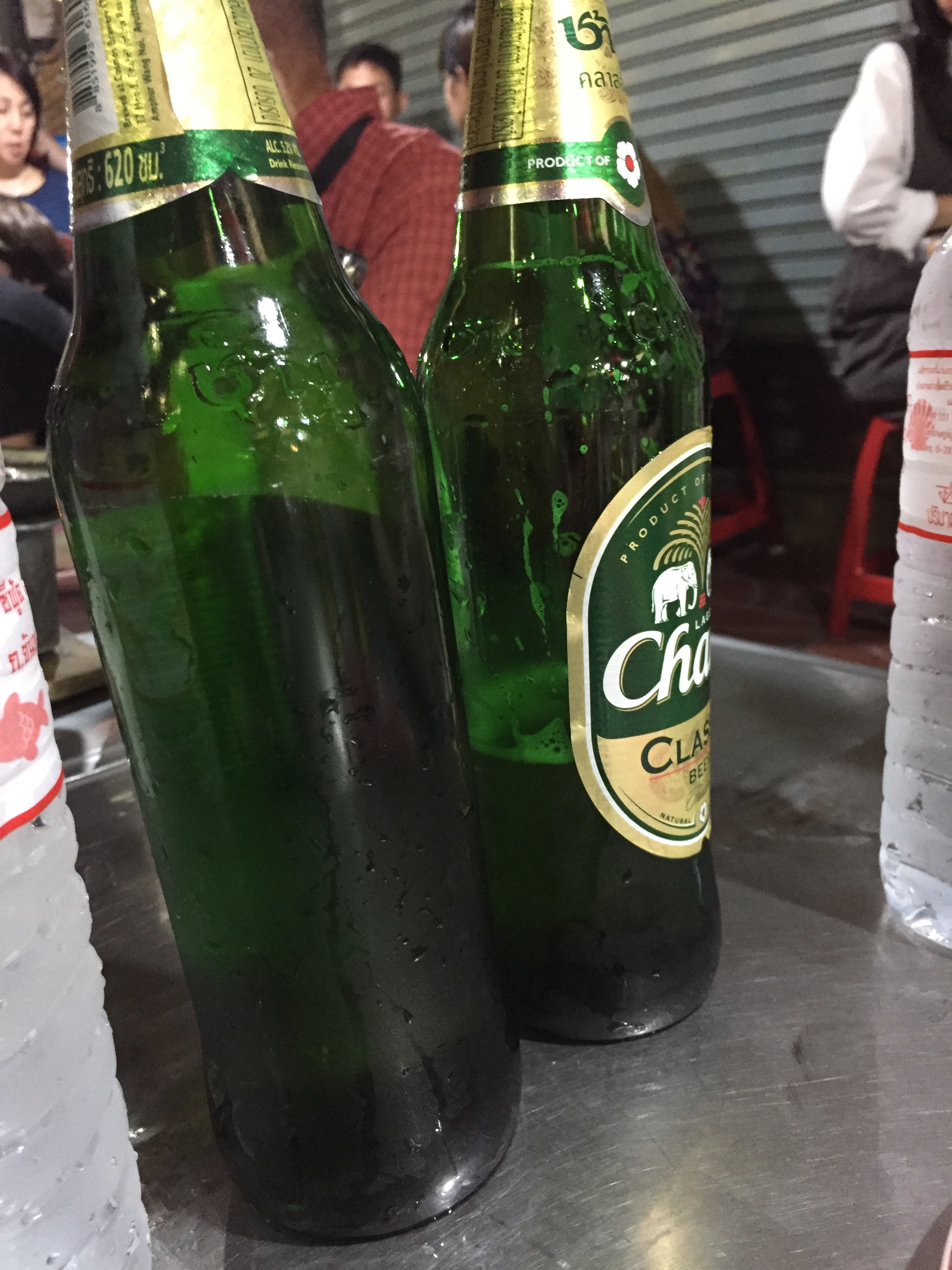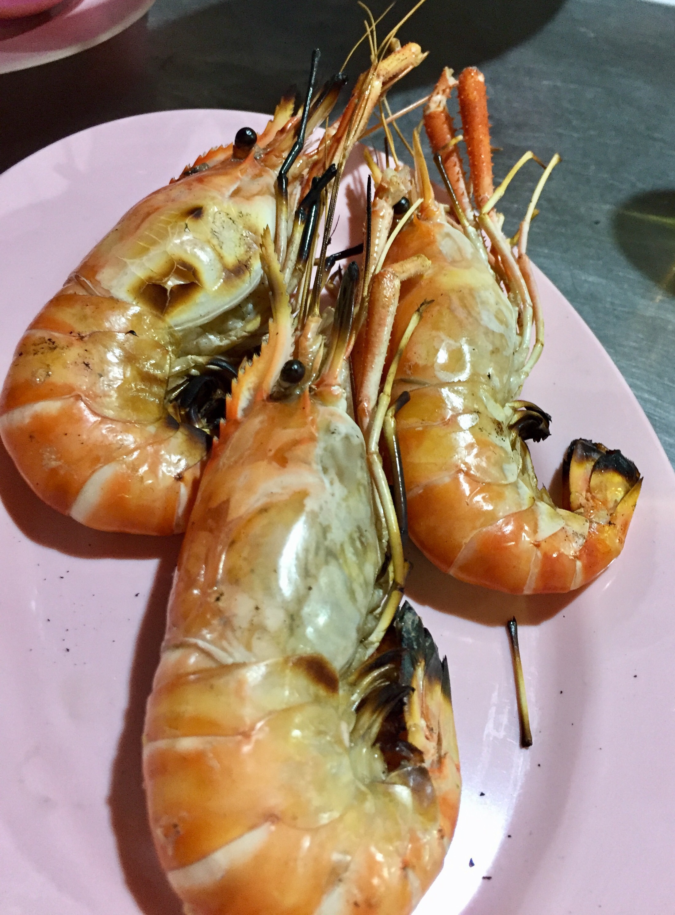 With the menu mostly in Thai, we got by with a lot of pointing, eventually ordering a platter of grilled prawns, a whole sea bass cooked in lemon and garlic, two bowls of rice and two Chang beers. Total cost, 760 THB, or about twenty bucks.