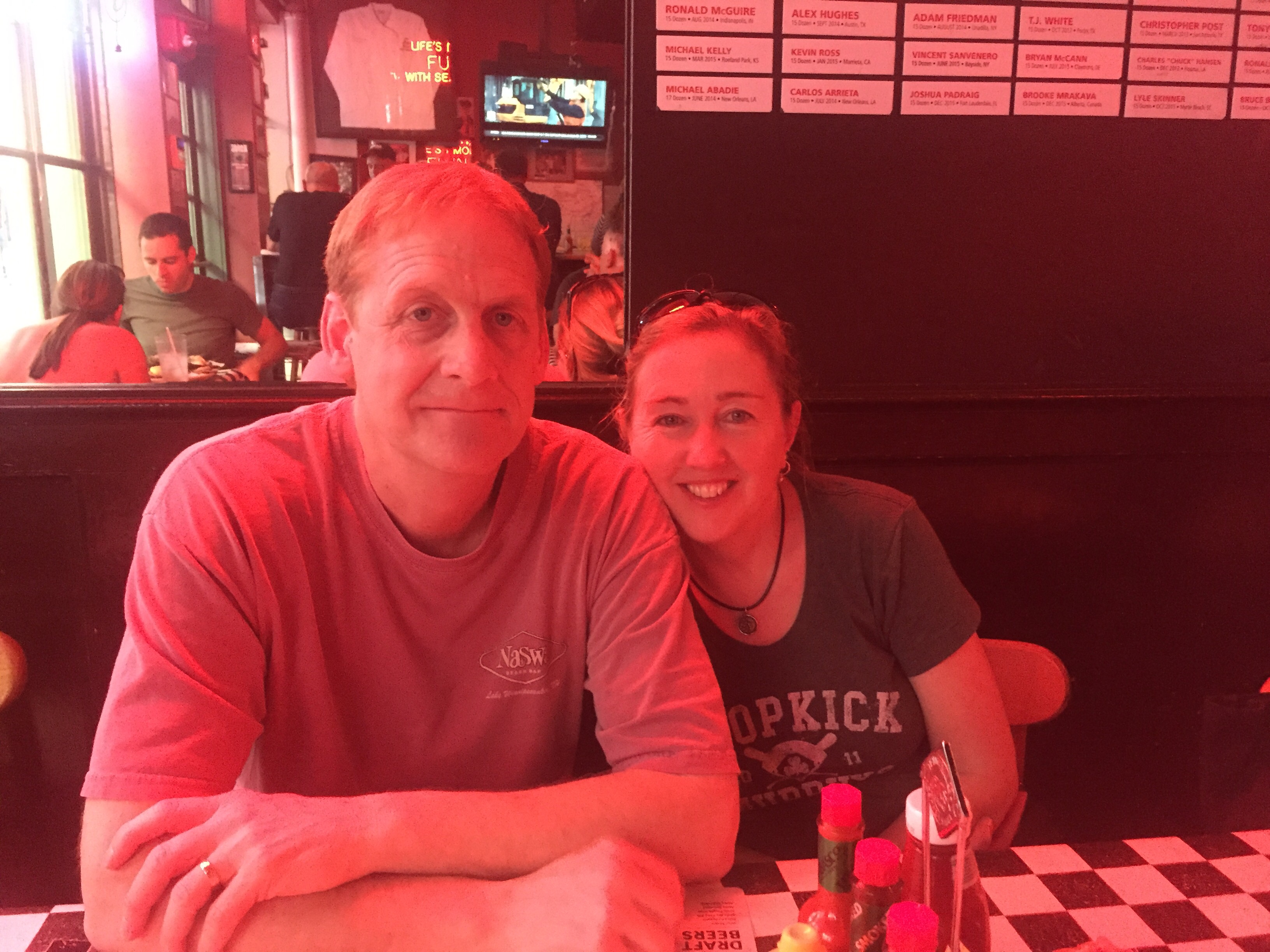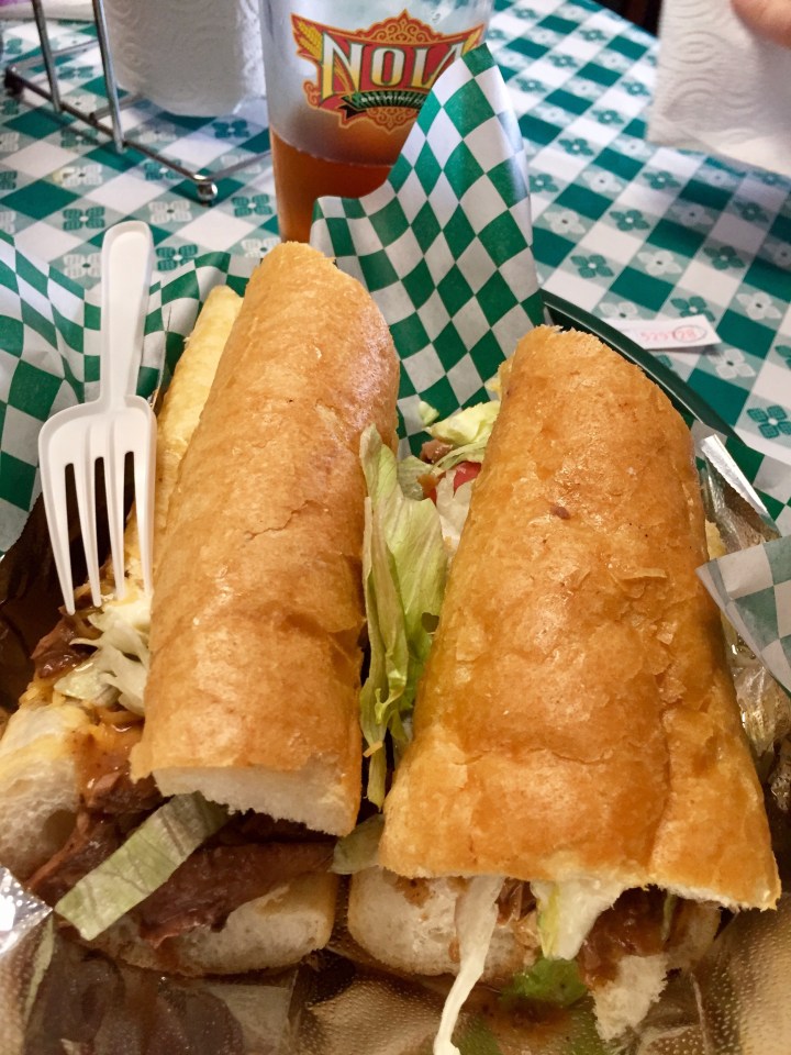 Naturally, all that walking worked up our appetites, so we couldn’t pass up a chance to try Parasol’s for po’boys, right nearby. This place is regularly on lists of “best po’boys”, a reputation well-deserved. Thank goodness we split them, because they’re huge. Rob and I shared a roast beef (which was dripping in delicious gravy), Ron and Kristan went with a pulled pork, which came dressed with coleslaw and creole mustard rather than the usual lettuce-tomato-mayo. Messy but well worth it.