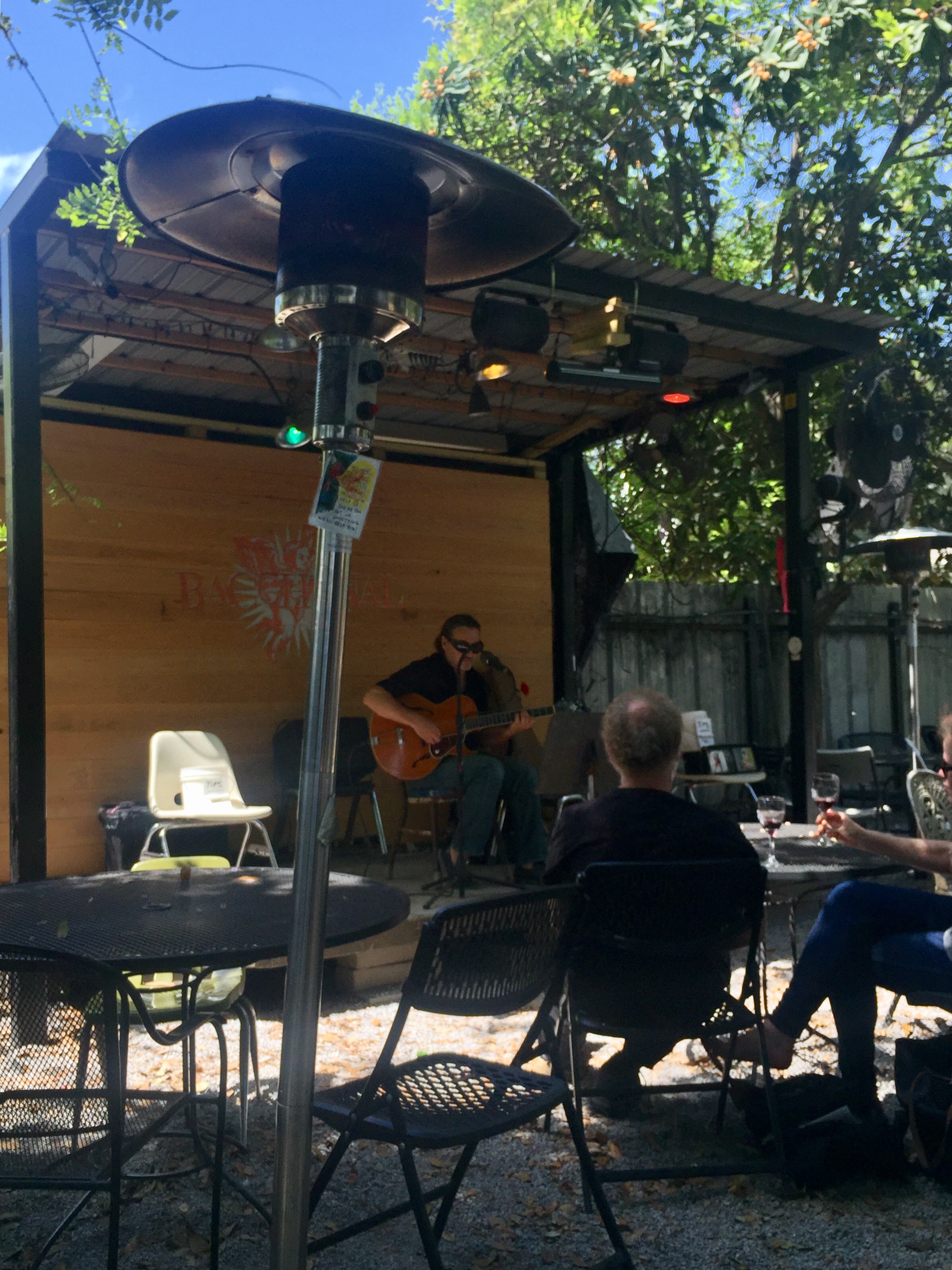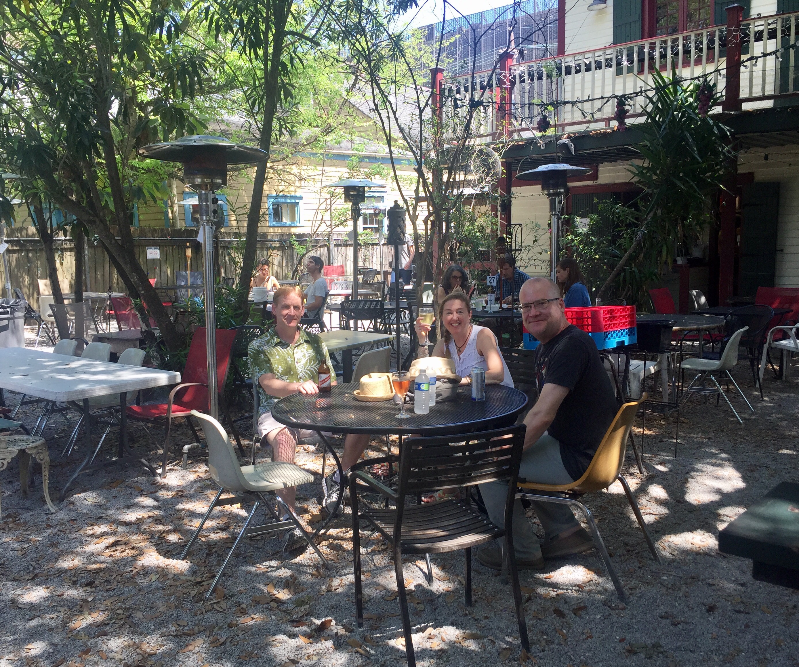 For our last full day together in New Orleans, we decided to bring Ron and Kristan up into the Bywater, a residential neighborhood northeast of the Marigny. On a previous visit we discovered the lovely painted houses and sleepy atmosphere, as well as a hidden gem: Bacchanal, a wine store where you can take your purchase and a couple of glasses out into the leafy backyard, and listen to live music. There’s also a window serving delicious, creative food.