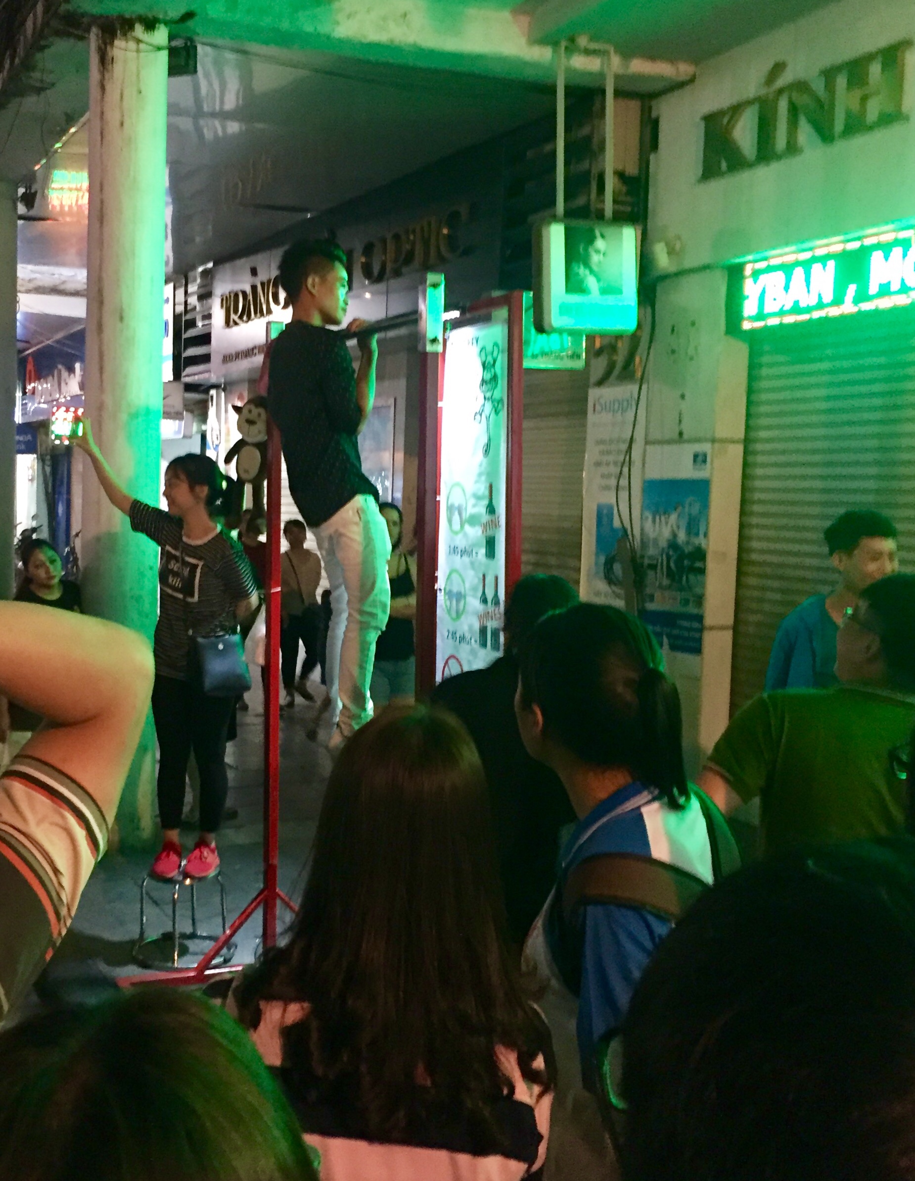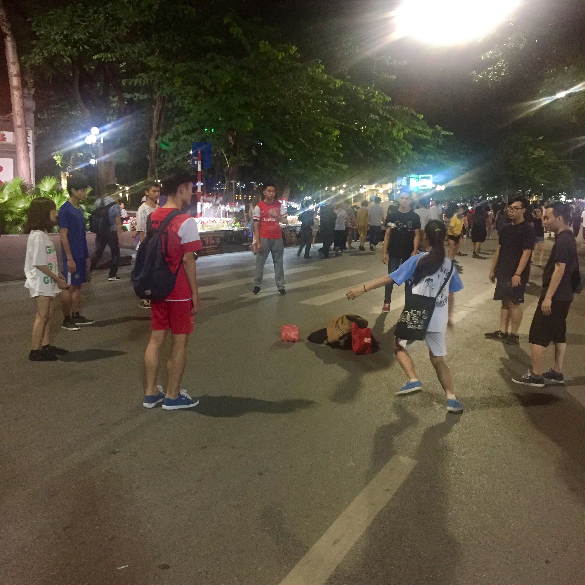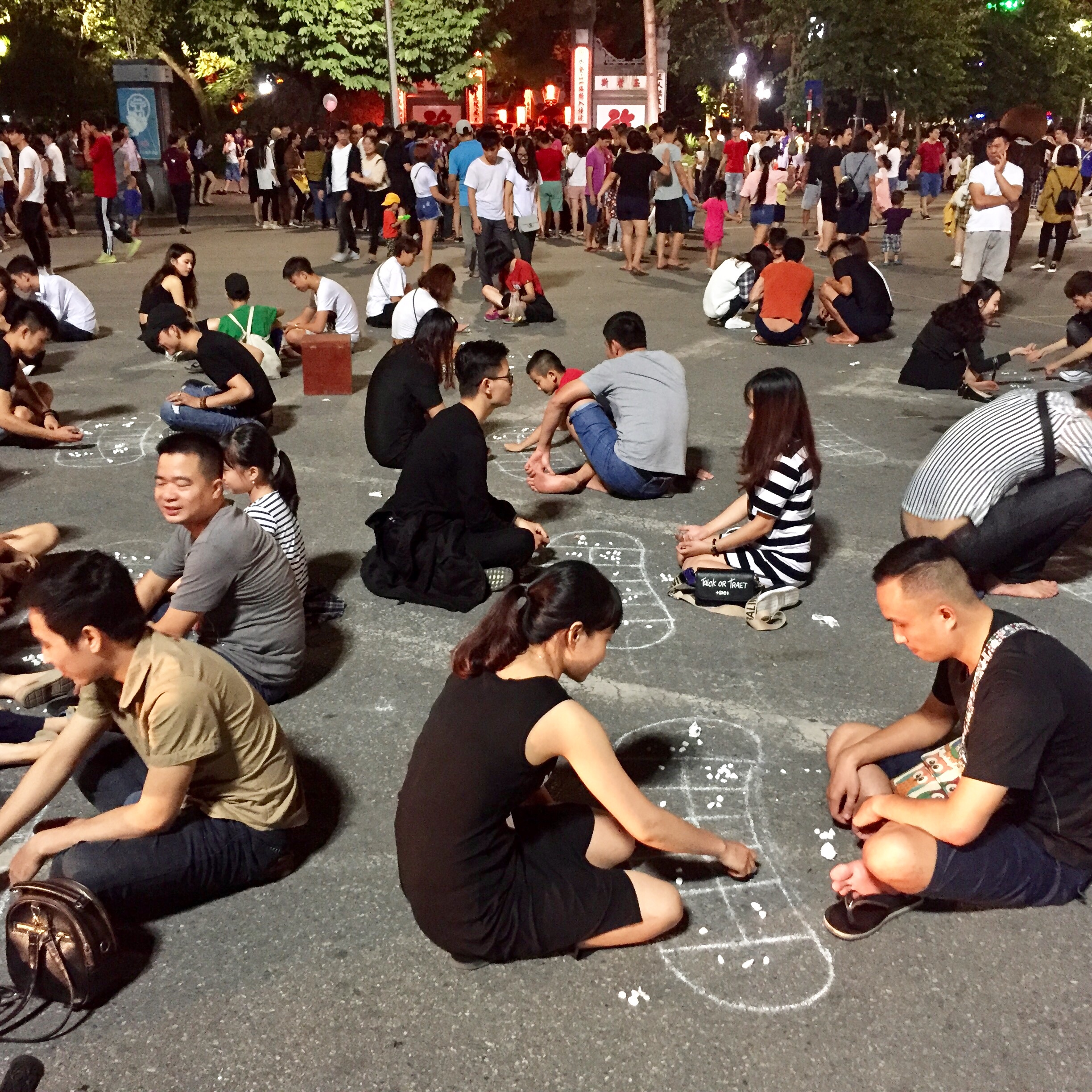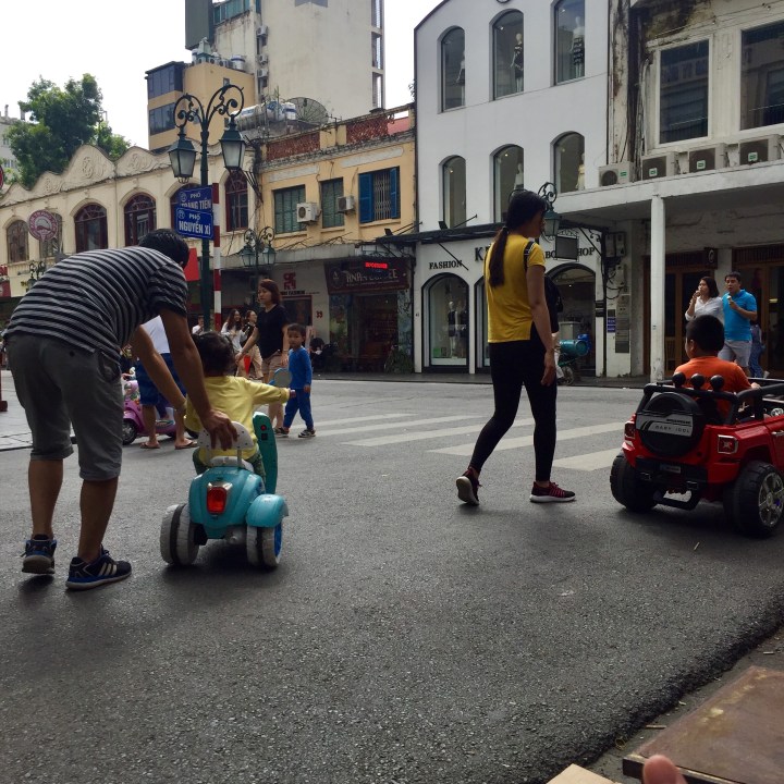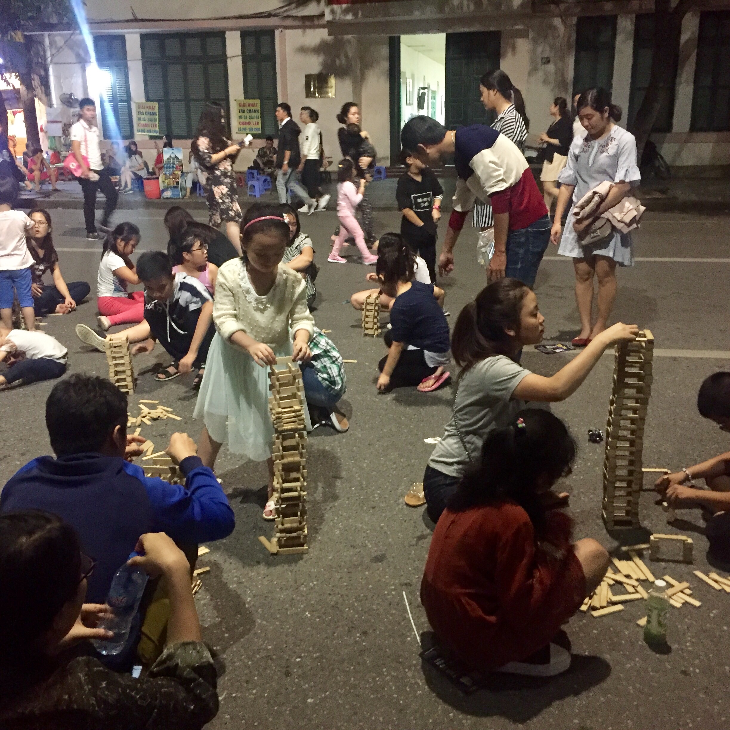 That sense was magnified our first weekend, when starting at 5PM on Friday the streets surrounding the lake were closed to traffic. A gigantic stage was being erected in Dong Kinh Ngiah Thuc Square. By Saturday morning the streets around the lake were teeming with students and families. As the weekend went on, side streets were taken over with dozens of mini cars toddlers could drive while their parents steered by remote control, dance competitions and feats of strength. Ice cream and fruit smoothies were consumed by the gallon. Everywhere people played badminton, jenga, or Chinese checkers, or danced everything from swing to the Macarena. By late Saturday, I couldn’t imagine there was a Hanoian sitting in an apartment anywhere. They were all gathered around the lake, actively participating in some type of activity.