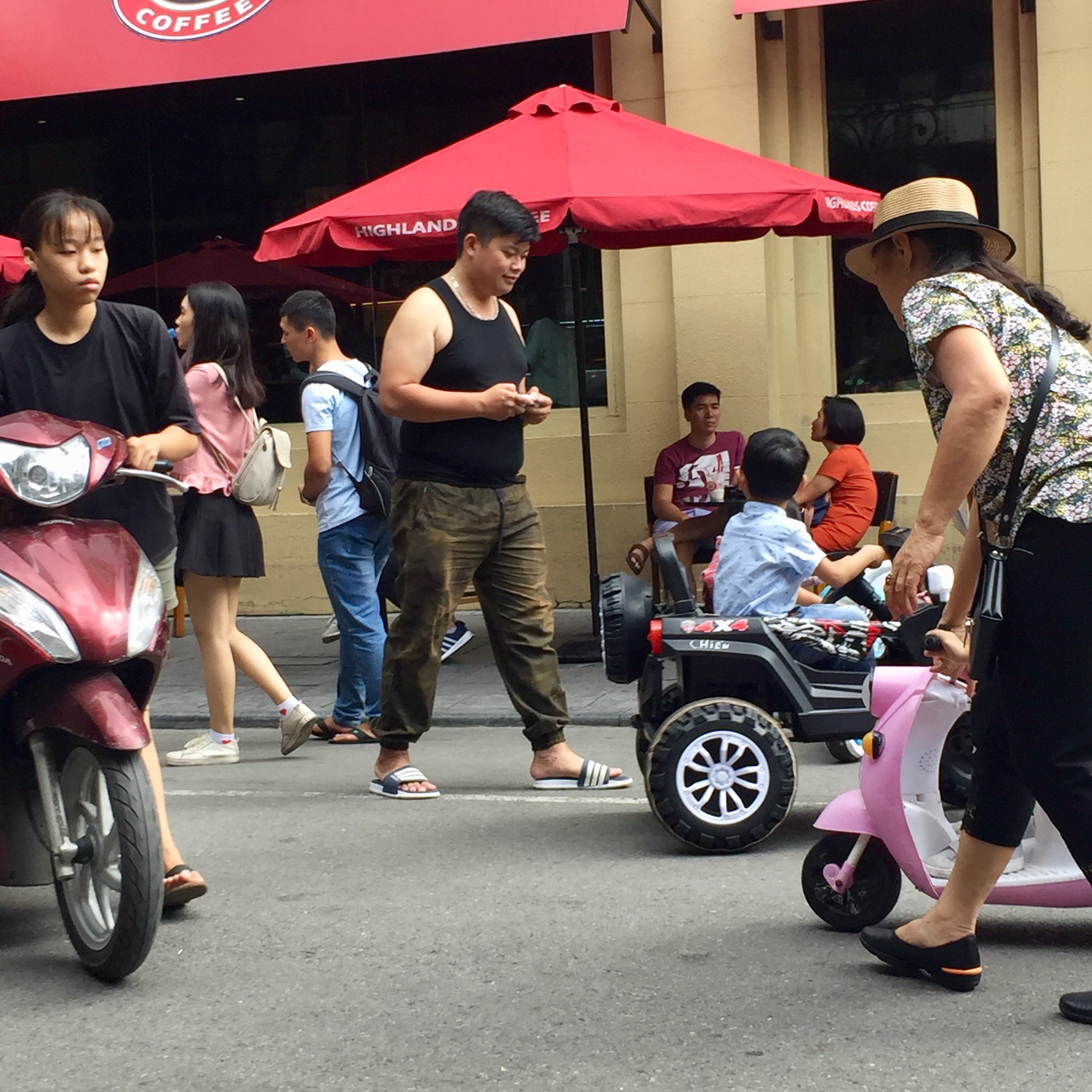 We have become expert at navigating the motorbike choked narrow streets and crossing intersections like an expert gamer in Frogger. We have learned sidewalks are for motorbike parking, street food vendors, and green tea pop-ups, not pedestrians; walkers take to the street. It’s actually easier.